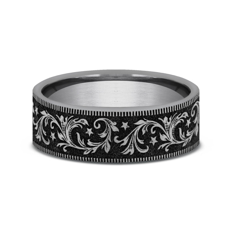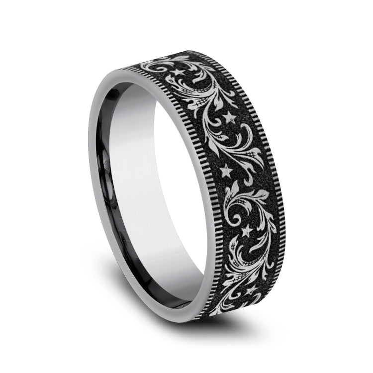 7mm, Comfort fit Tungsten Barrel script pattern, thin edges