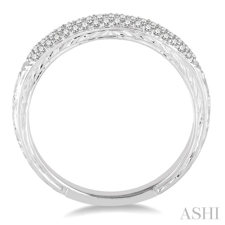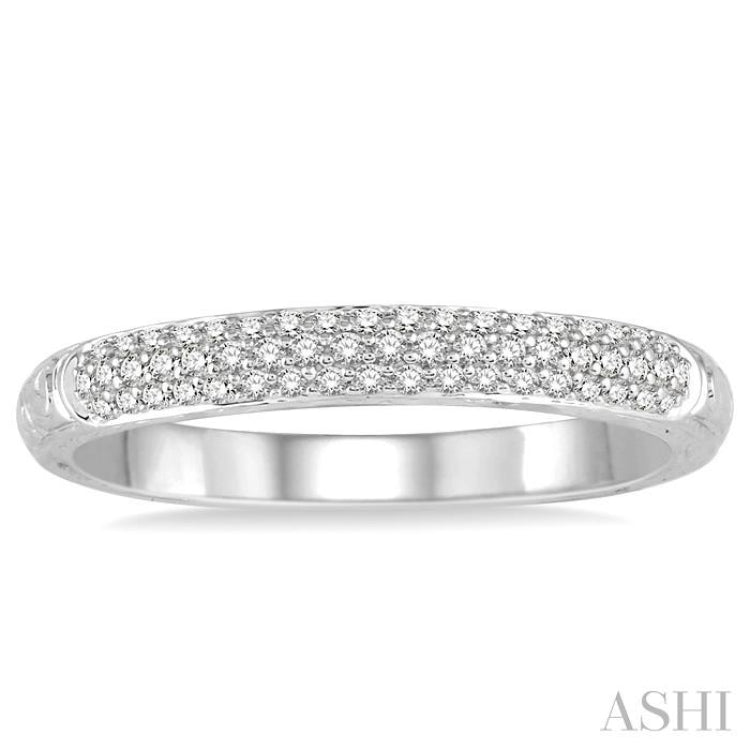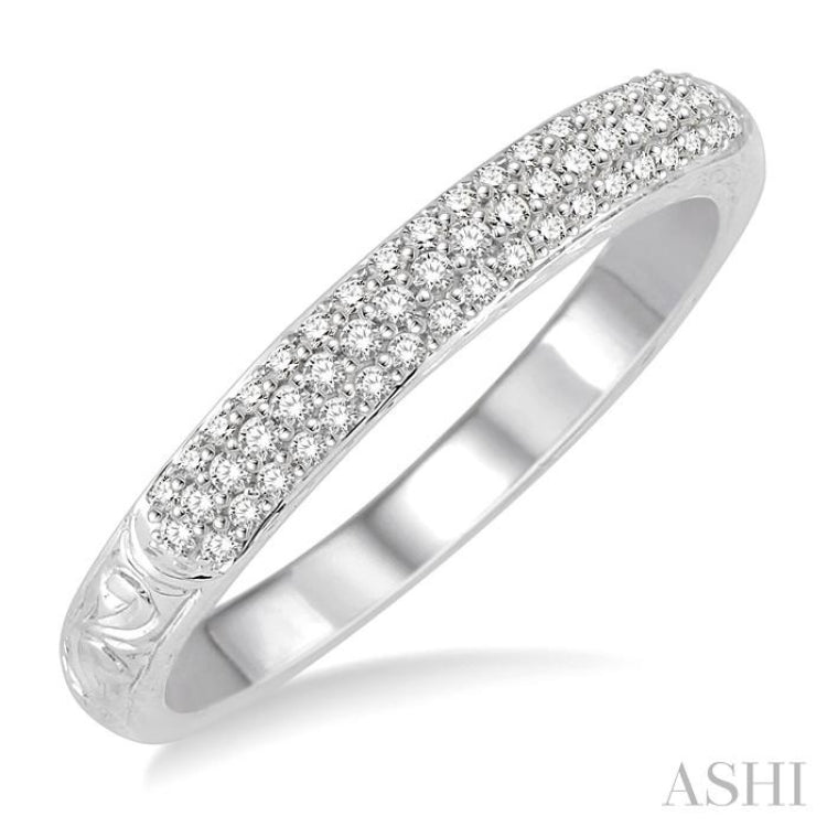 This is a dainty wedding band that is the perfect accompaniment to your wedding celebrations. It features 55 pave set round cut diamonds, skillfully put together all around the band with engraving finish to give it an unmatched brilliance in 14 karat White Gold. Total diamond weight is 1/5 Ctw.
