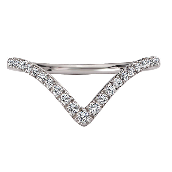 14kt white gold wedding band with diamonds lining a curved front. (D1/6 carat total weight)
