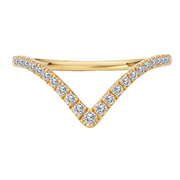14kt yellow gold wedding band with diamonds lining a curved front. (D1/6 carat total weight)