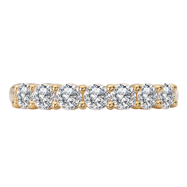 14kt yellow gold wedding band adorned with 7 round diamonds across the front. (D 7/8 carat total weight)