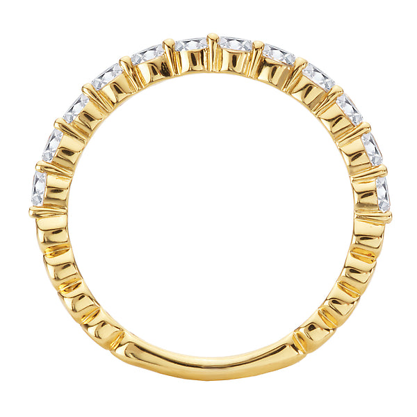14kt yellow gold straight front wedding band lined with round diamonds. (D5/7 carat total weight)