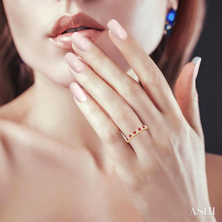 Make your wedding special with a unique wedding band. A wedding band that offers the beauty of both diamonds and rubies is something you could go for. The precious stone Ruby adds extra glamor to a diamond band, just like it does in this ring here. With 2.3 MM rubies gracing the diamond wedding band, the ring offers beauty and sophistication to the core. There is a row of 5 pave set round cut rubies alternated by 6 pave set round cut diamonds decorating the ring. The wedding band is fashioned in a polished finish 14 karat yellow gold. Total diamond weight is 1/4 Ctw and round cut Ruby measures 2.3 MM.
