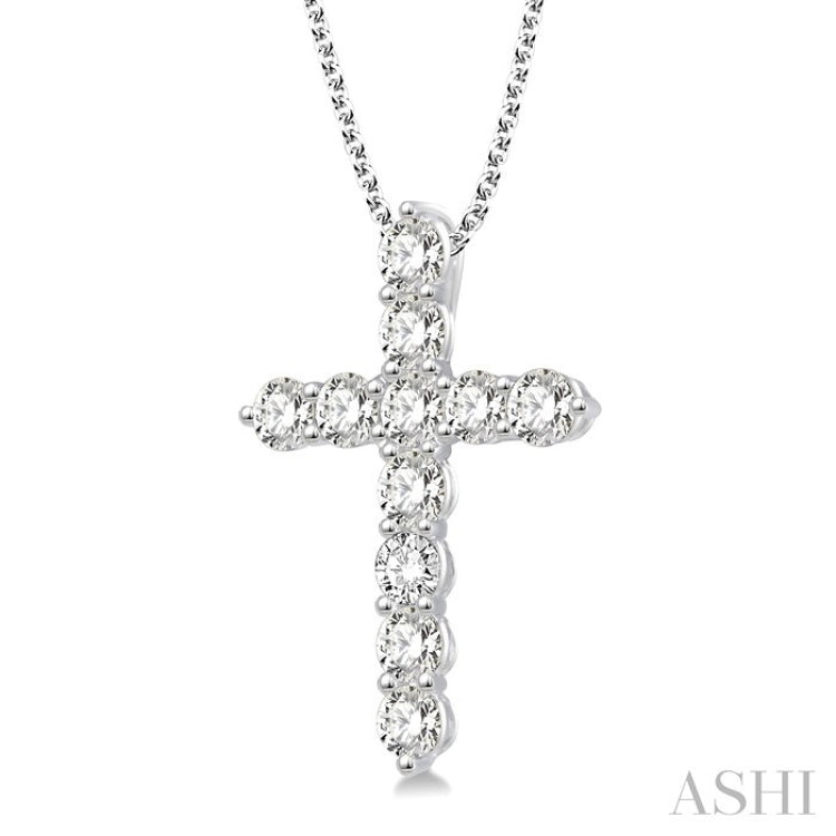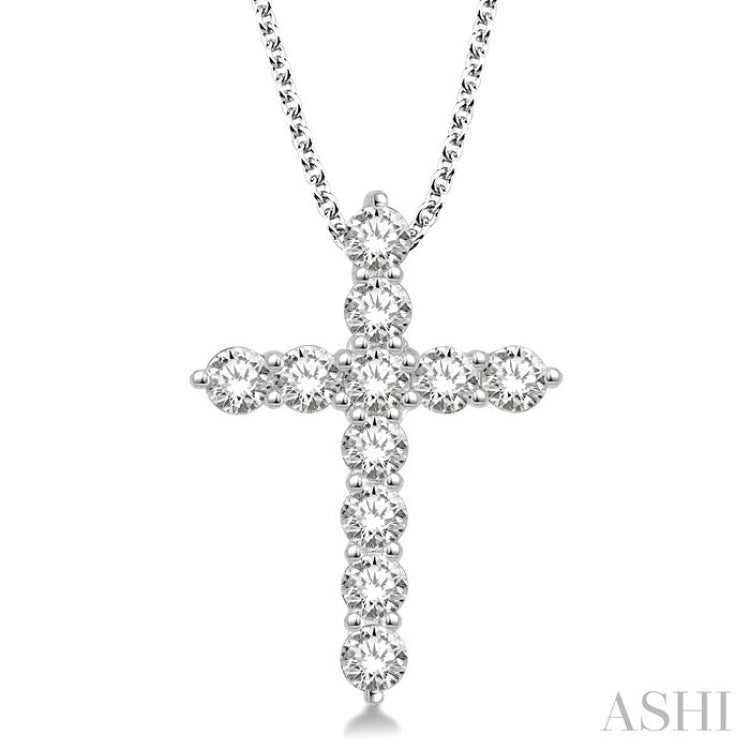Express your love and faith in God with this charming diamond cross pendant. Gleaming 14 karat white gold pendant is adorned with 11 radiant prong set round cut diamonds arranged around the cross. It dangles from an elegant Cable Chain. Total diamond weight is 1 1/2 Ctw.