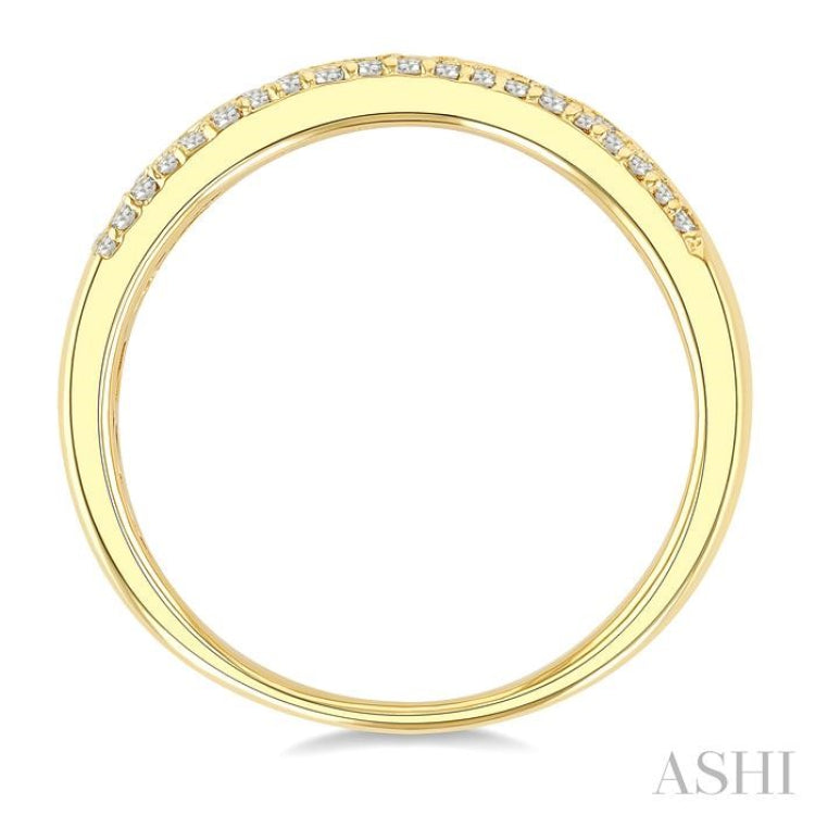 A garden of light, captured in gold, this diamond fashion band brings a poetic touch to everyday elegance. It is a composition of symmetry and spontaneity; elegant, expressive, and effortlessly unique. On the ring top, at the center of the top rim blooms a delicate floral motif, formed by 7 pave hand set round cut diamonds, one in the center, encircled by 6. On either side of this luminous bloom, a twin row of 31 pave hand set round cut diamonds create a radiant band of brilliance, hugging the rim in a mirror-like cascade. For a final flourish, 7 flush set round cut diamonds are artfully scattered across the remaining gold surface in a graceful zig-zag, creating a mosaic-like interplay of sparkle and negative space. The fashion band is styled 10 karat yellow gold. Total diamond weight is 1/4 ctw.