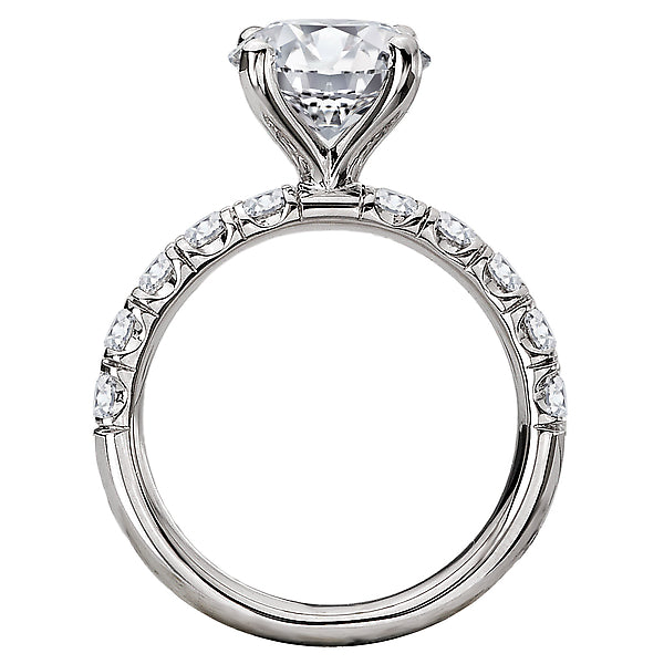 This 14kt white gold ring has round lab grown diamonds set with 4-prong pegs along either side of a center setting that will accommodate a 9.0mm round stone. (D 1.0 carat total weight)