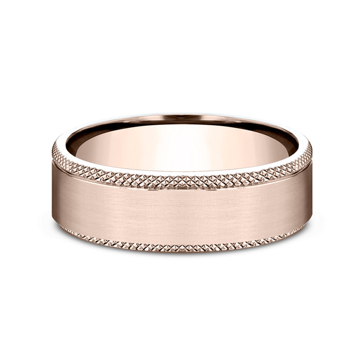 6.5mm, Lightweight comfort fit 14K Rose Gold Satin finish center, knurl detailed edges